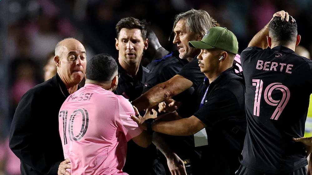 इंटर मियामी और इंडिपेंडिएंट डेल वैले के बीच हुए दोस्ताना मैच के दौरान स्टार फुटबॉलर लियोनेल मेसी पिच पर गिर गए. एक अति उत्साही फैन की वजह से ऐसा हुआ, जो मेसी से मिलने के लिए उनके करीब आ गया. वो शर्टलेस फैन सुरक्षा को तोड़कर सीधे मेसी की ओर दौड़ा और उन्हें गले लगाने की कोशिश की. सुरक्षा गार्ड ने फैन को रोकते समय गलती से मेसी को भी गिरा दिया. हालांकि, मेसी तुरंत उठकर सामान्य स्थिति में लौट आए और कोई चोट नहीं आई.