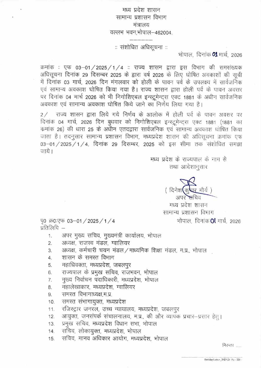 पूर्व में 29 दिसंबर 2025 की अधिसूचना के अनुसार केवल 3 मार्च 2026 (मंगलवार) को होली का अवकाश घोषित था। अब इसे संशोधित कर 4 मार्च 2026 (बुधवार) को भी छुट्टी का दिन तय किया गया है। यह अवकाश 'निगोशिएबल इन्स्ट्रूमेन्ट्स एक्ट 1881' की धारा 25 के अंतर्गत घोषित किया गया है, जिसका अर्थ है कि यह सार्वजनिक और सामान्य अवकाश की श्रेणी में आएगा। यह संशोधित अधिसूचना मध्य प्रदेश के राज्यपाल के नाम से और आदेशानुसार सामान्य प्रशासन विभाग के अपर सचिव दिनेश कुमार मौर्य द्वारा 1 मार्च 2026 को जारी की गई है